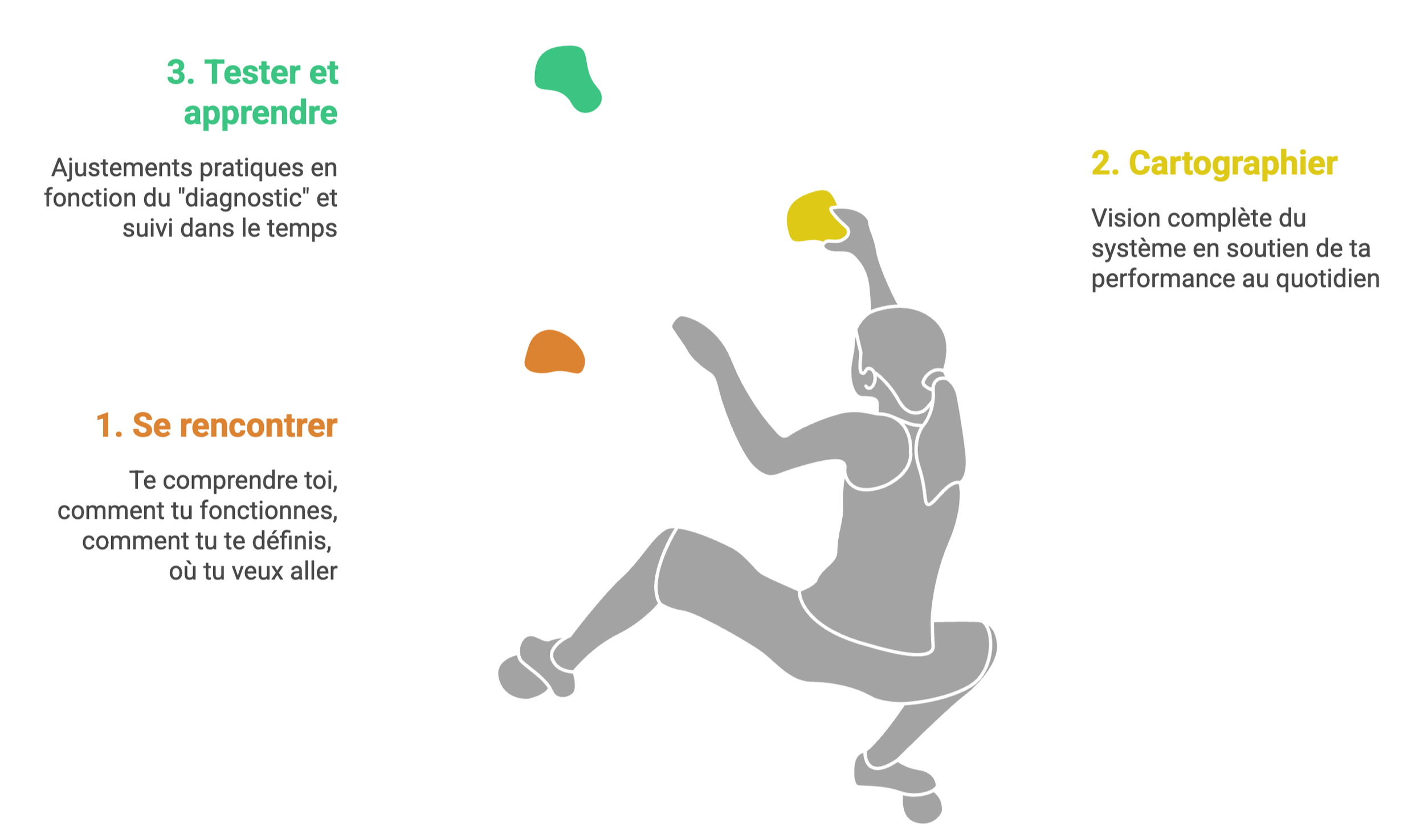 Je ne pars pas non plus d'un protocole tout fait, avant de te proposer quoi que ce soit, je dois comprendre qui tu es vraiment : comment tu penses, comment tu te racontes ton propre parcours, où sont tes angles morts, ce que tu exprimes et ce que tu n'exprimes pas.